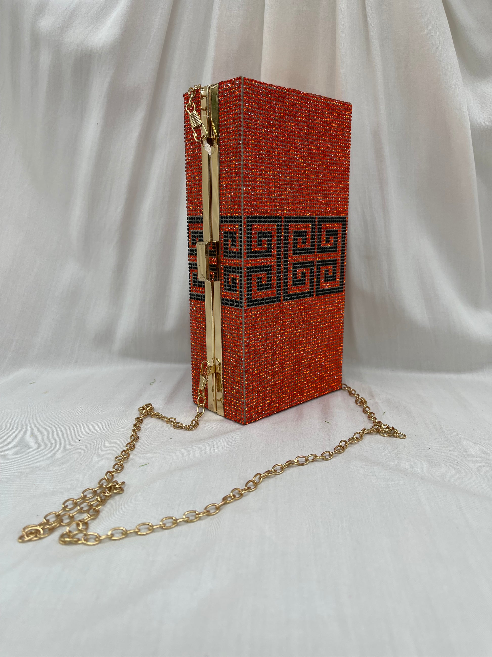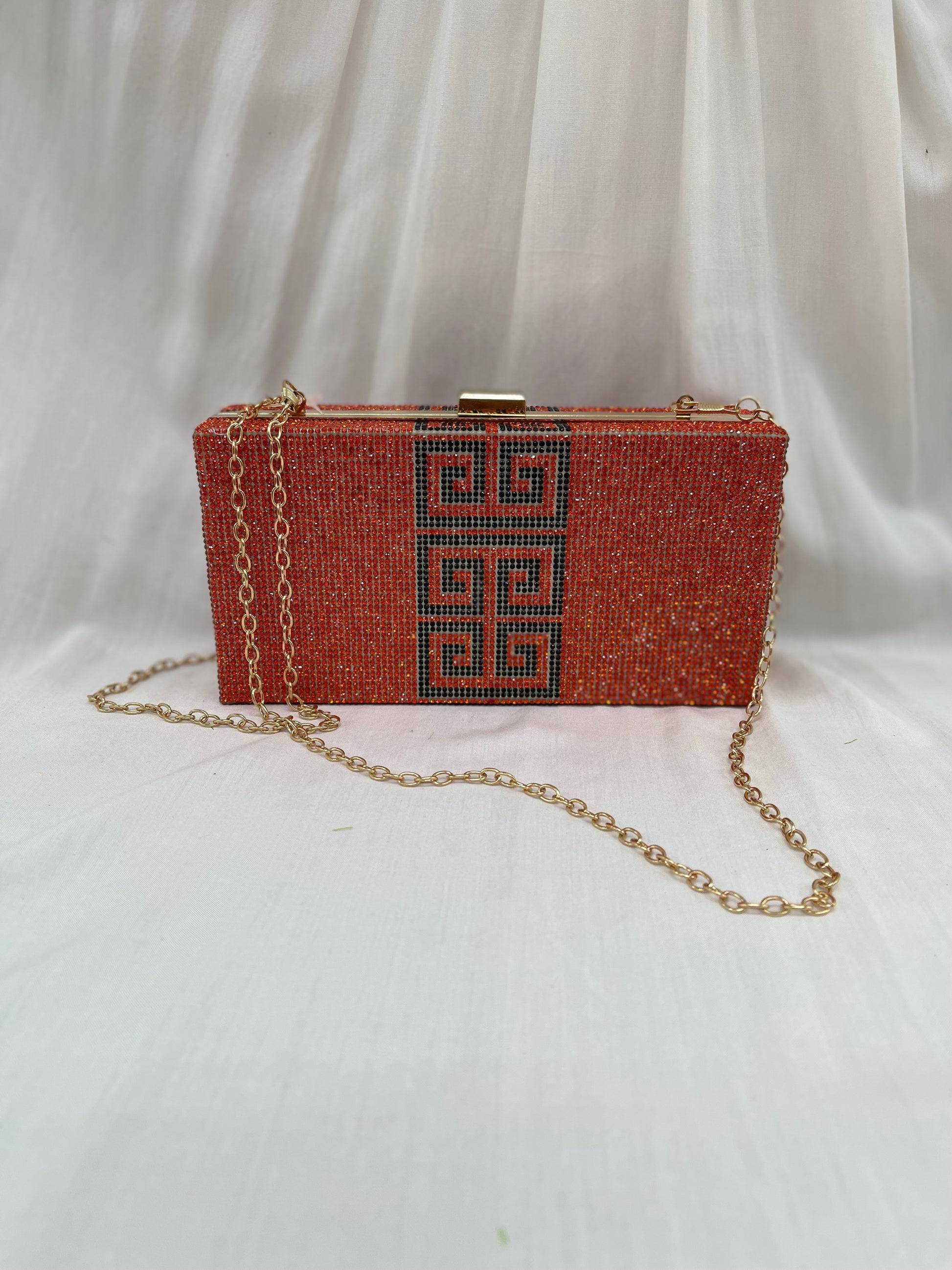 Ajoutez une touche de glamour à vos soirées avec cette pochette rigide ornée de strass rouges et noirs scintillants. Son motif géométrique grec apporte une élégance classique et intemporelle, parfaite pour compléter vos tenues les plus sophistiquées.
