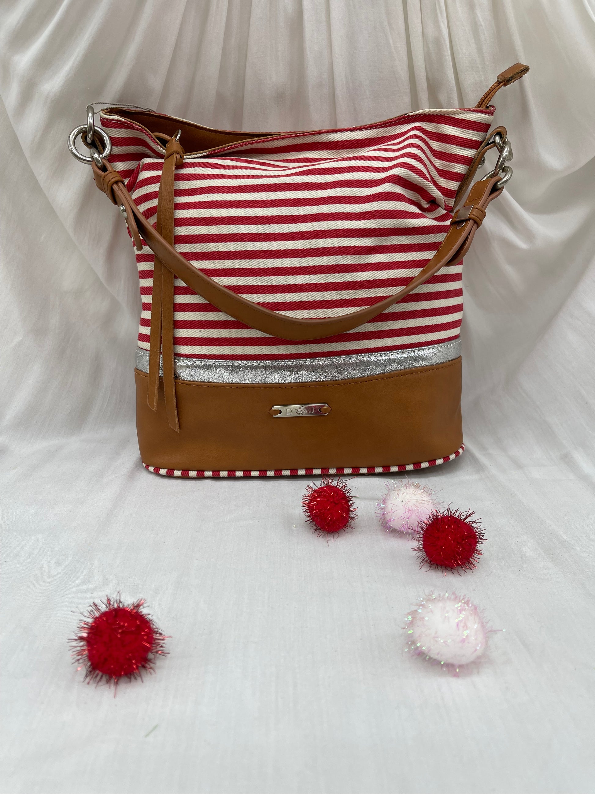 Inspirez vos looks avec ce sac rayé marin qui allie élégance et décontraction. Ses rayures rouges et blanches, associées aux finitions en cuir camel, en font le compagnon idéal pour vos escapades estivales ou vos journées décontractées.